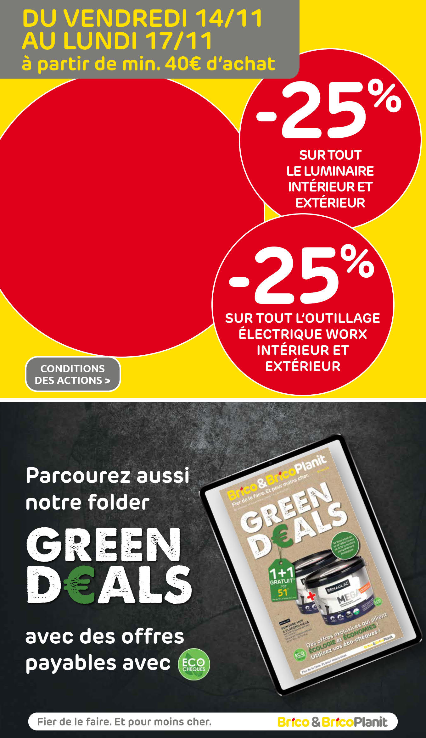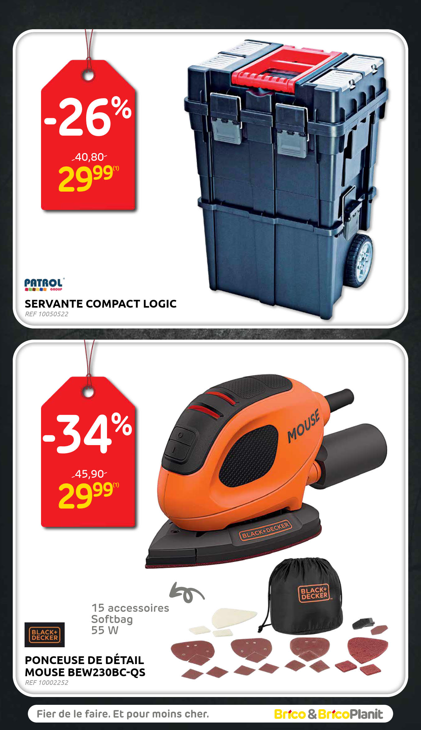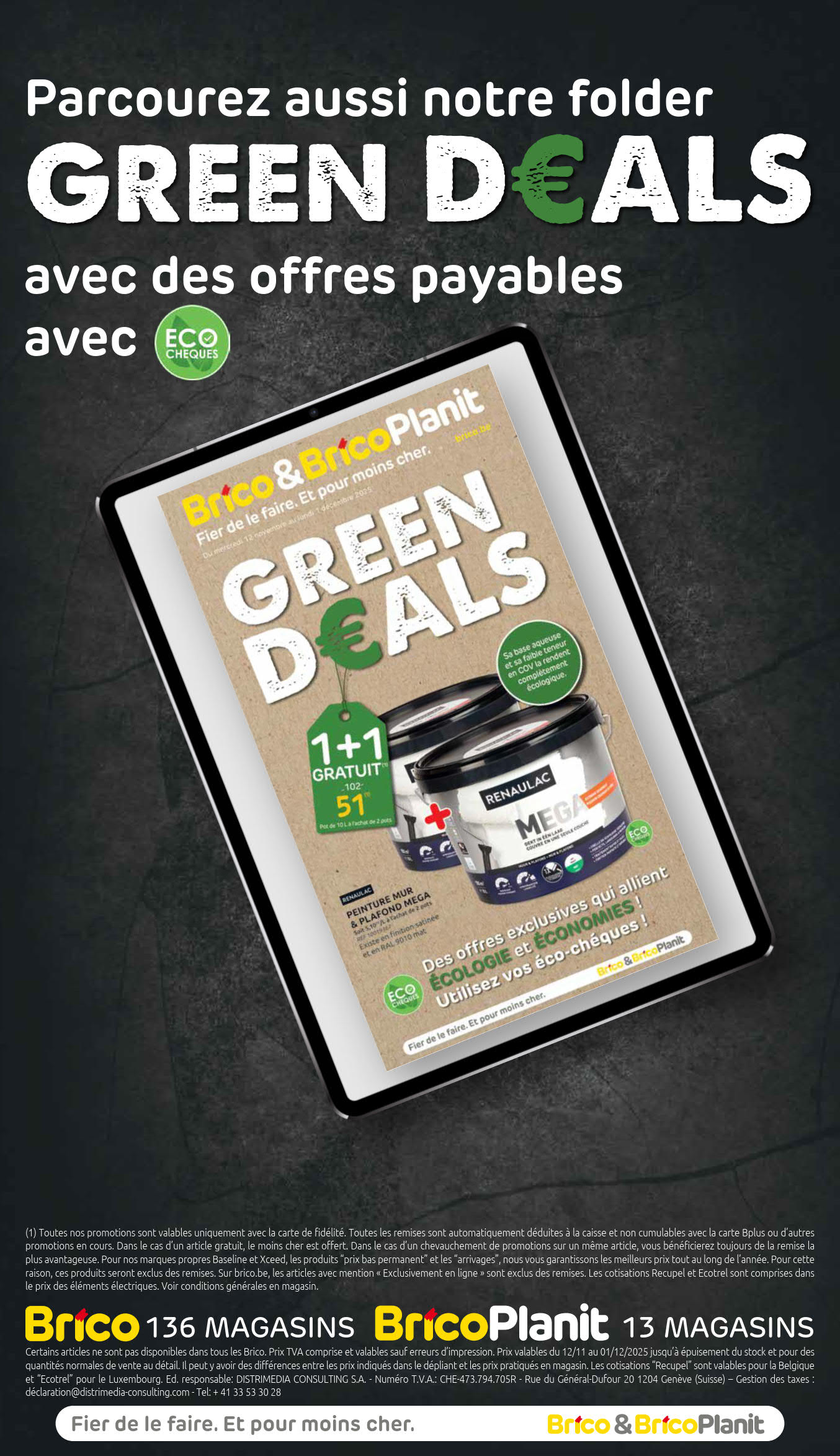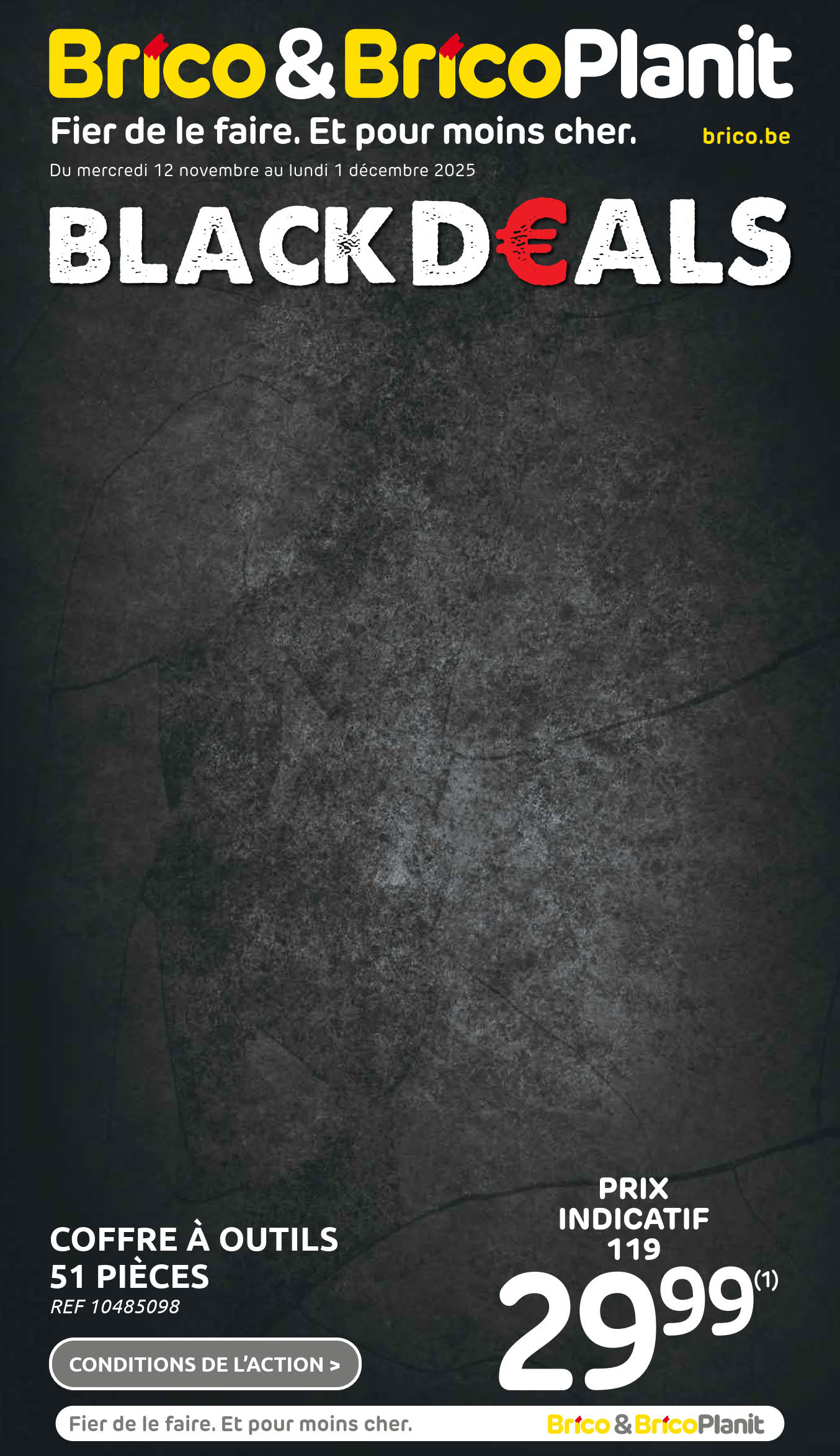 Vous êtes à la recherche de bonnes affaires et de réductions exceptionnelles? Ne cherchez plus loin que Brico pour répondre à tous vos besoins en matière de shopping. Nos promotions et offres sont proposées à des prix incroyablement bas, et notre gamme de produits convient à tous les goûts et à tous les budgets. Consultez notre brochure de promotion valable du 12 novembre au 01 décembre, et explorez le catalogue pour créer votre liste de courses. Ne manquez pas nos offres hebdomadaires et nos offres exclusives et restez à jour avec les dernières offres et réductions chez Brico.