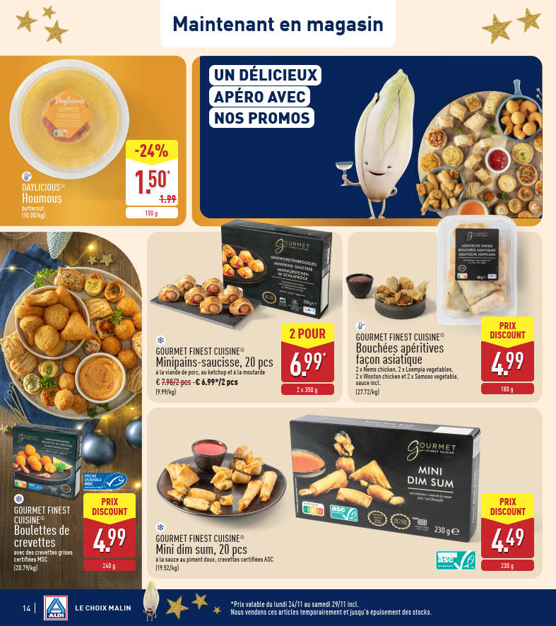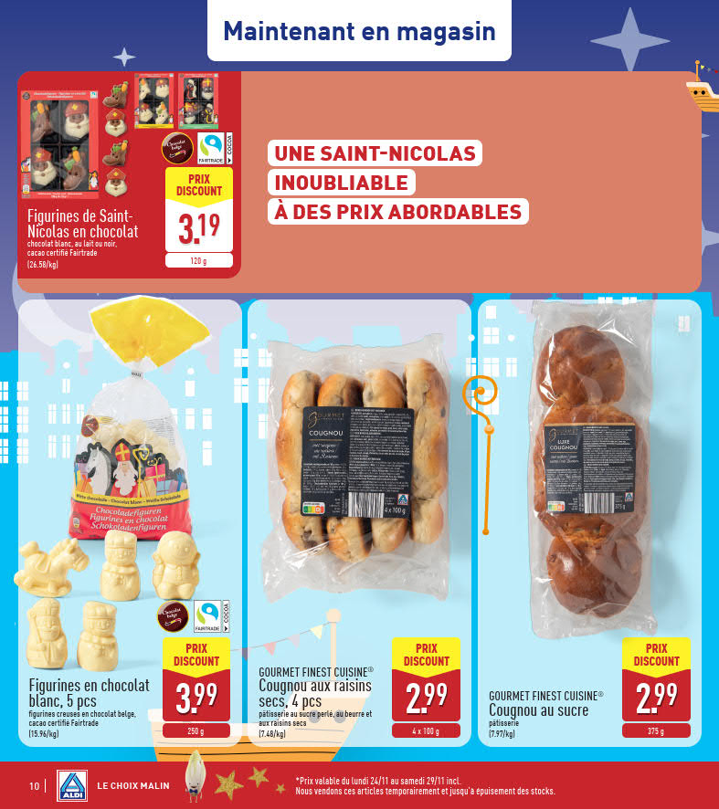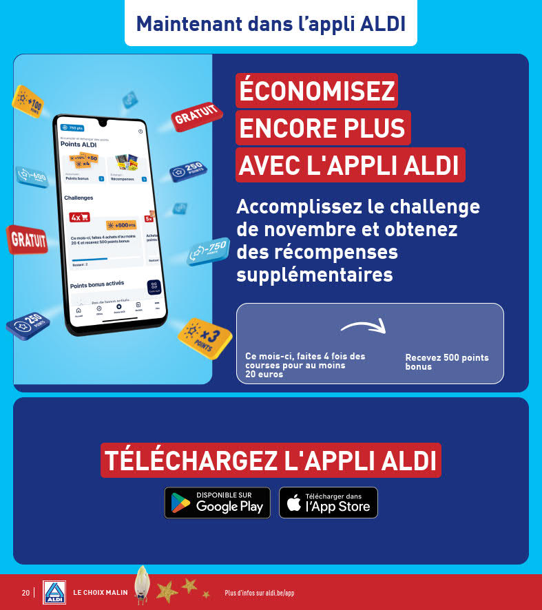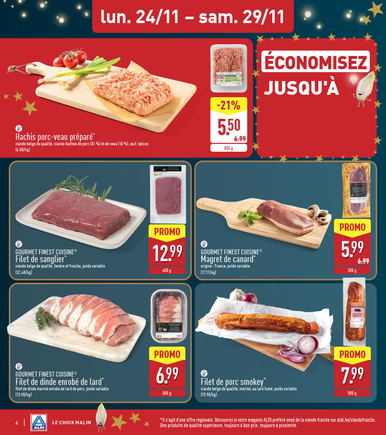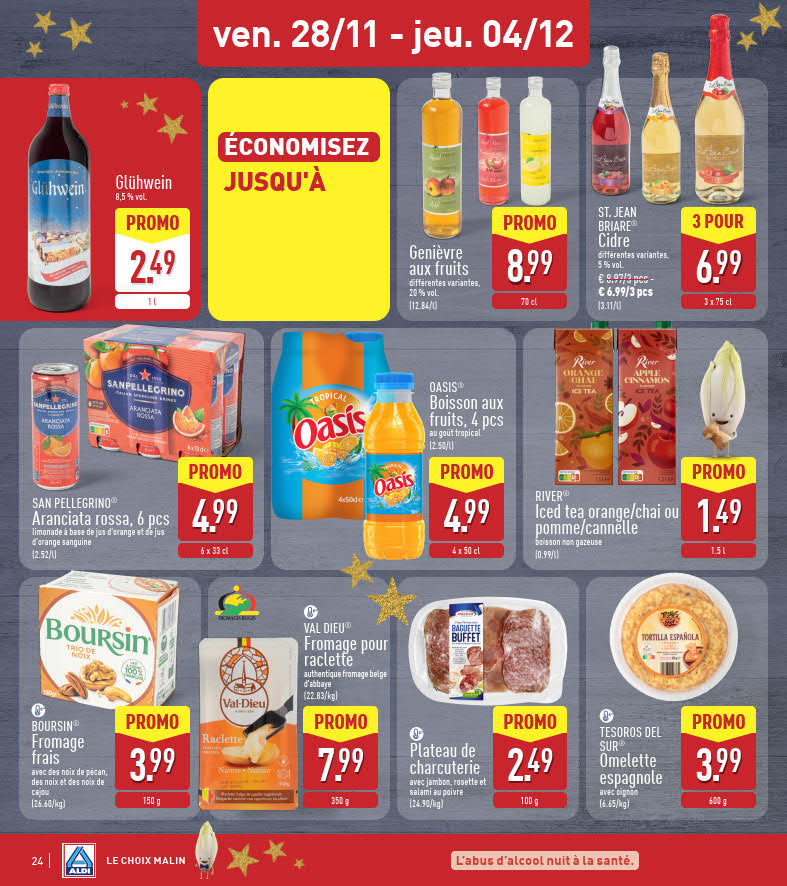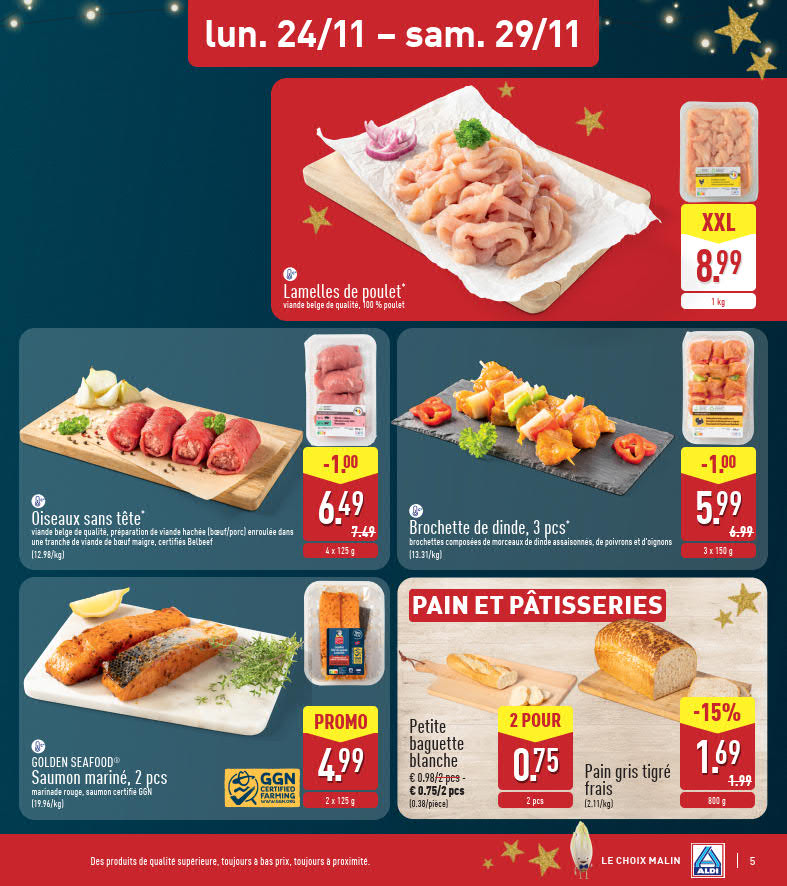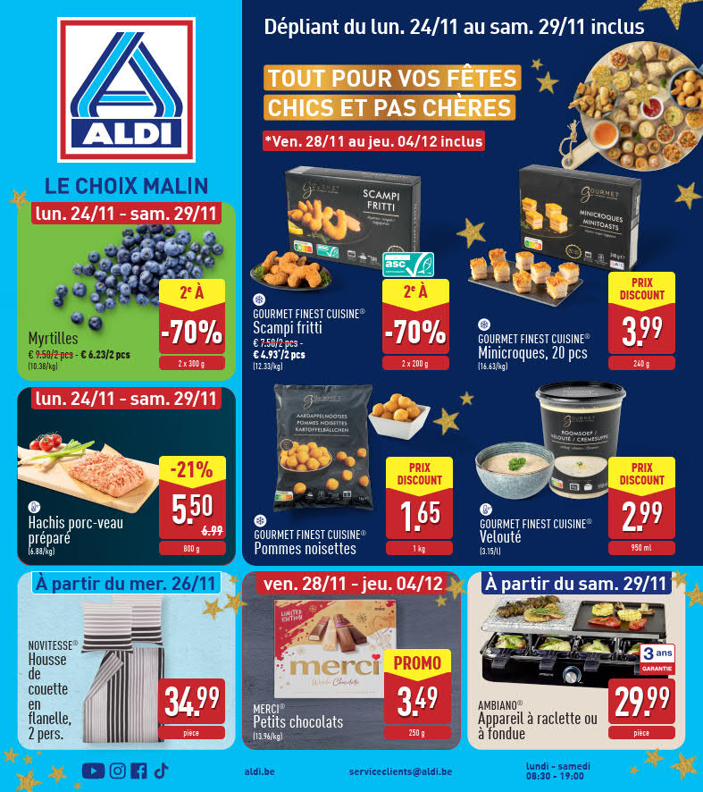 Vous êtes à la recherche de bonnes affaires et de réductions exceptionnelles? Ne cherchez plus loin que Aldi pour répondre à tous vos besoins en matière de shopping. Nos promotions et offres sont proposées à des prix incroyablement bas, et notre gamme de produits convient à tous les goûts et à tous les budgets. Consultez notre brochure de promotion valable du 24 novembre au 30 novembre, et explorez le catalogue pour créer votre liste de courses. Ne manquez pas nos offres hebdomadaires et nos offres exclusives et restez à jour avec les dernières offres et réductions chez Aldi.