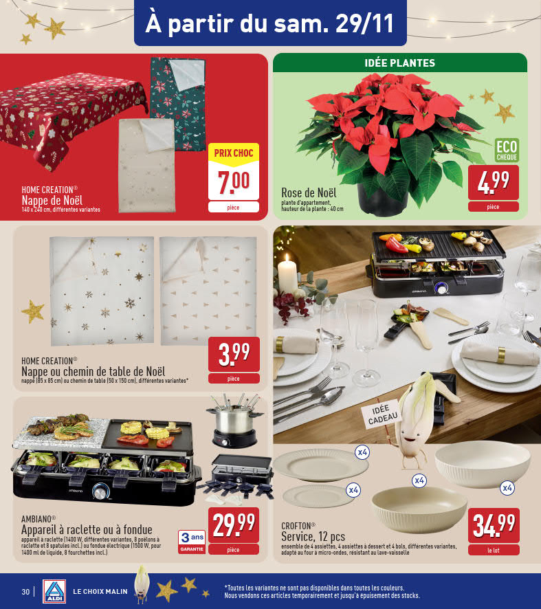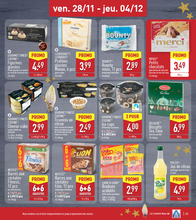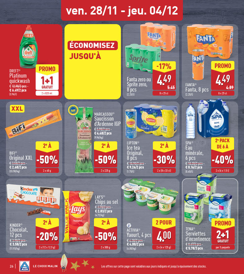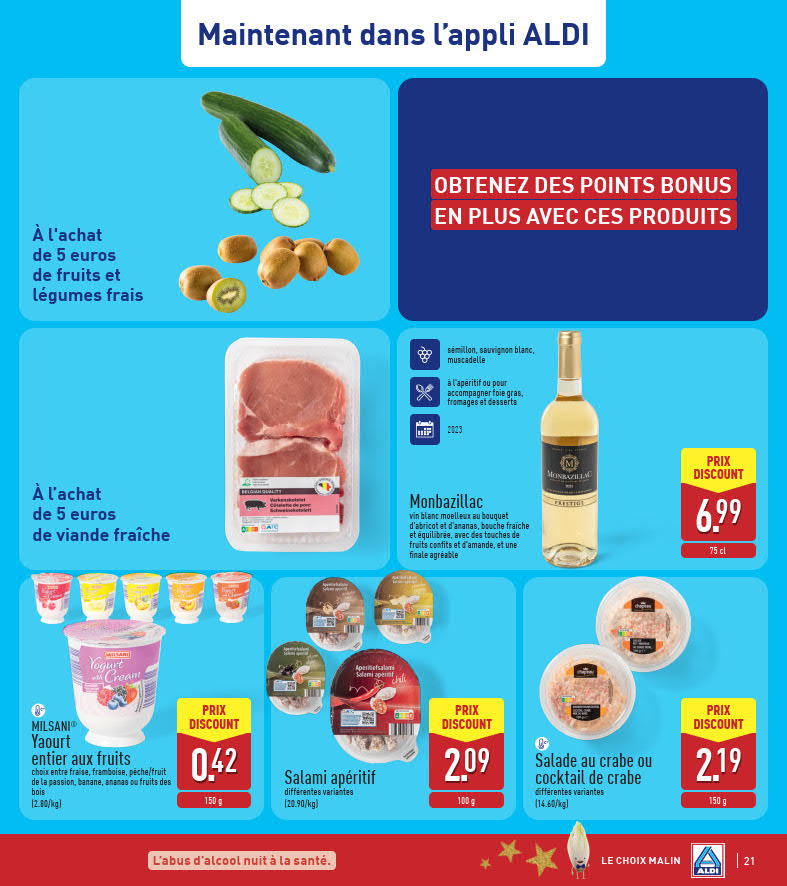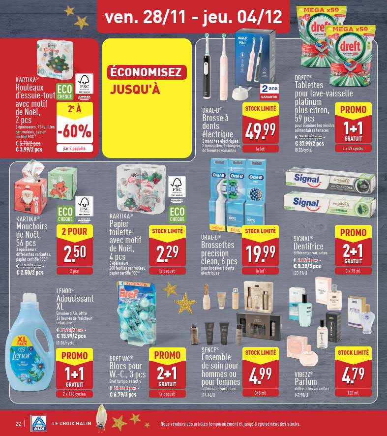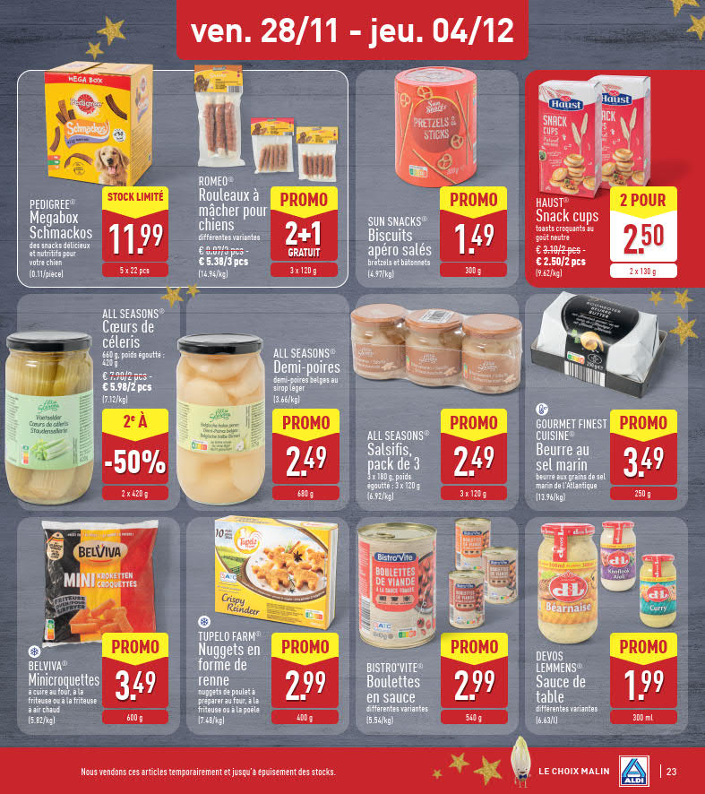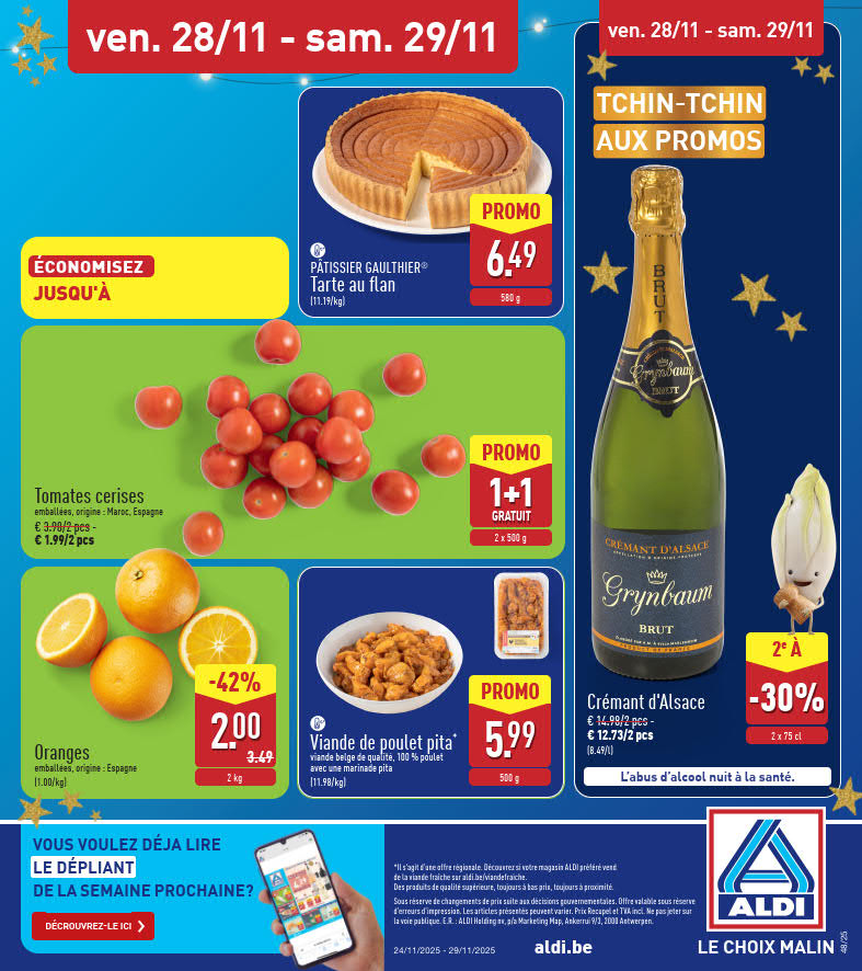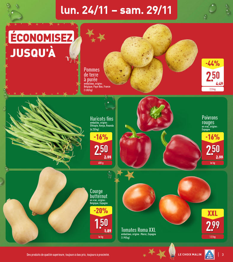 Vous êtes à la recherche de bonnes affaires et de réductions exceptionnelles? Ne cherchez plus loin que Aldi pour répondre à tous vos besoins en matière de shopping. Nos promotions et offres sont proposées à des prix incroyablement bas, et notre gamme de produits convient à tous les goûts et à tous les budgets. Consultez notre brochure de promotion valable du 24 novembre au 30 novembre, et explorez le catalogue pour créer votre liste de courses. Ne manquez pas nos offres hebdomadaires et nos offres exclusives et restez à jour avec les dernières offres et réductions chez Aldi.