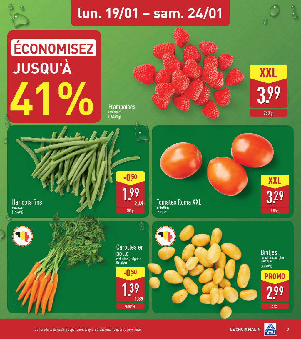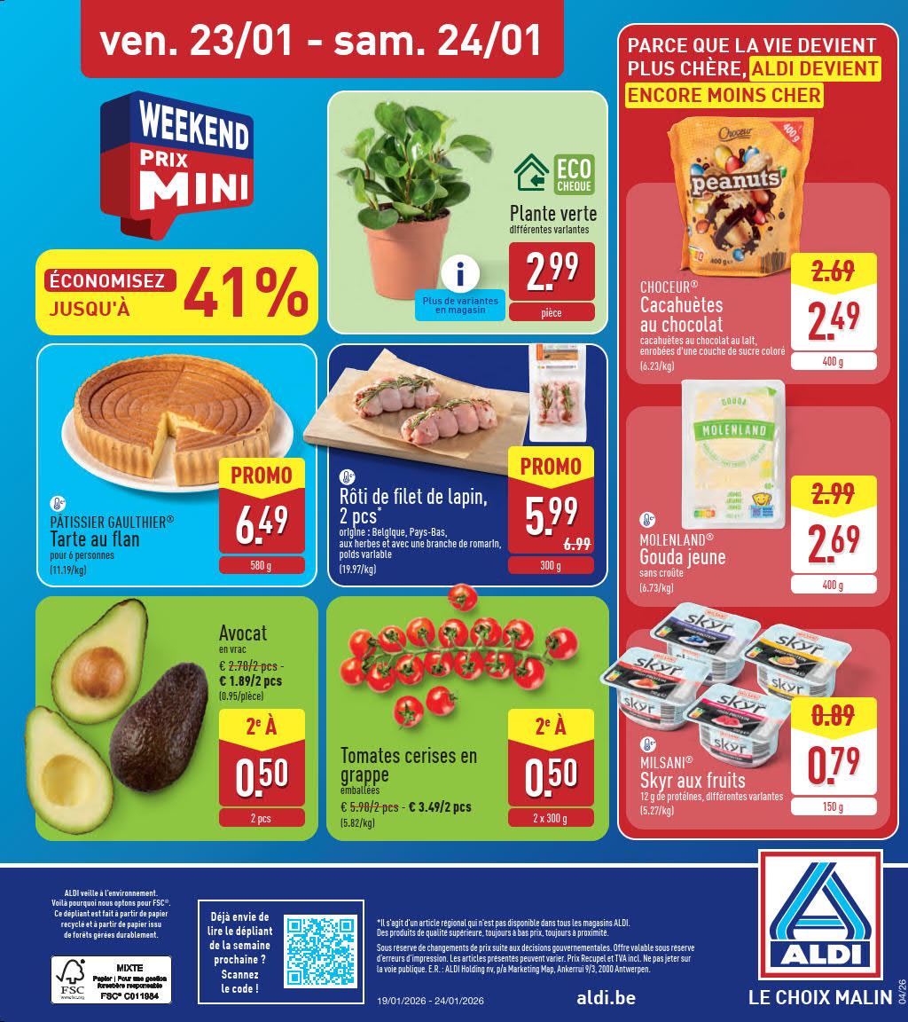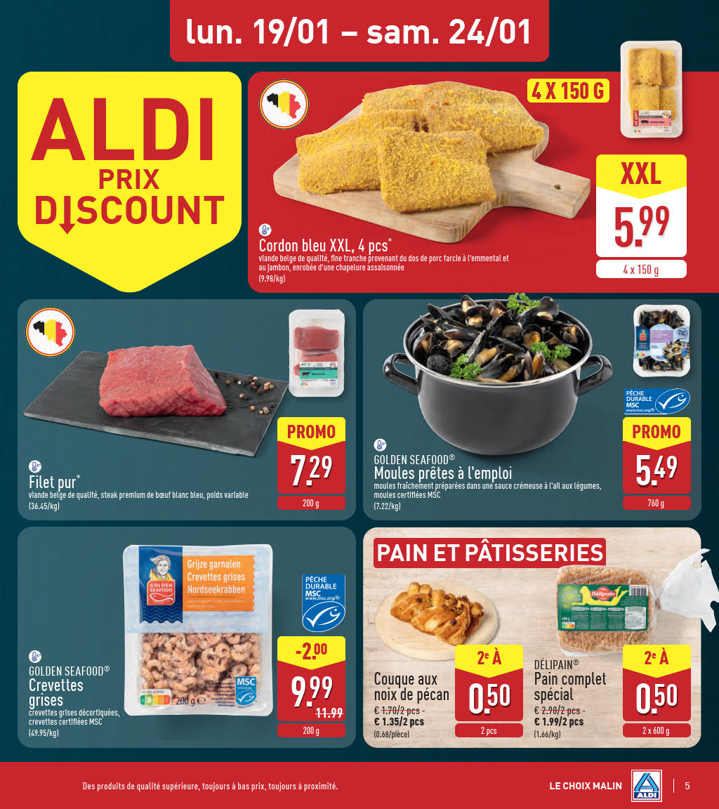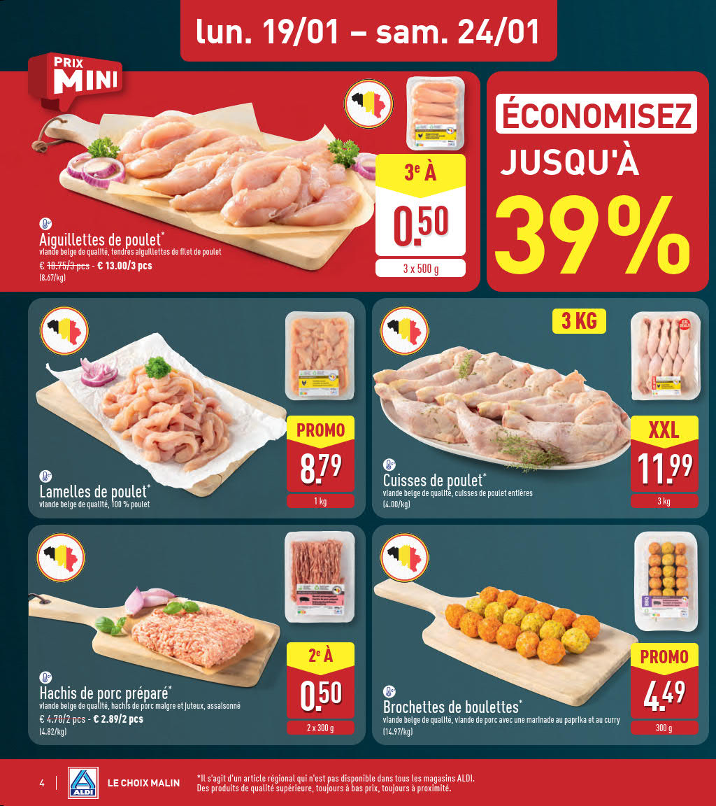 Vous êtes à la recherche de bonnes affaires et de réductions exceptionnelles? Ne cherchez plus loin que Aldi pour répondre à tous vos besoins en matière de shopping. Nos promotions et offres sont proposées à des prix incroyablement bas, et notre gamme de produits convient à tous les goûts et à tous les budgets. Consultez notre brochure de promotion valable du 19 janvier au 24 janvier, et explorez le catalogue pour créer votre liste de courses. Ne manquez pas nos offres hebdomadaires et nos offres exclusives et restez à jour avec les dernières offres et réductions chez Aldi.
