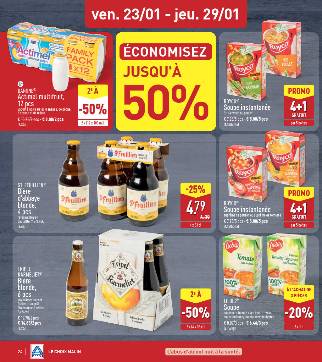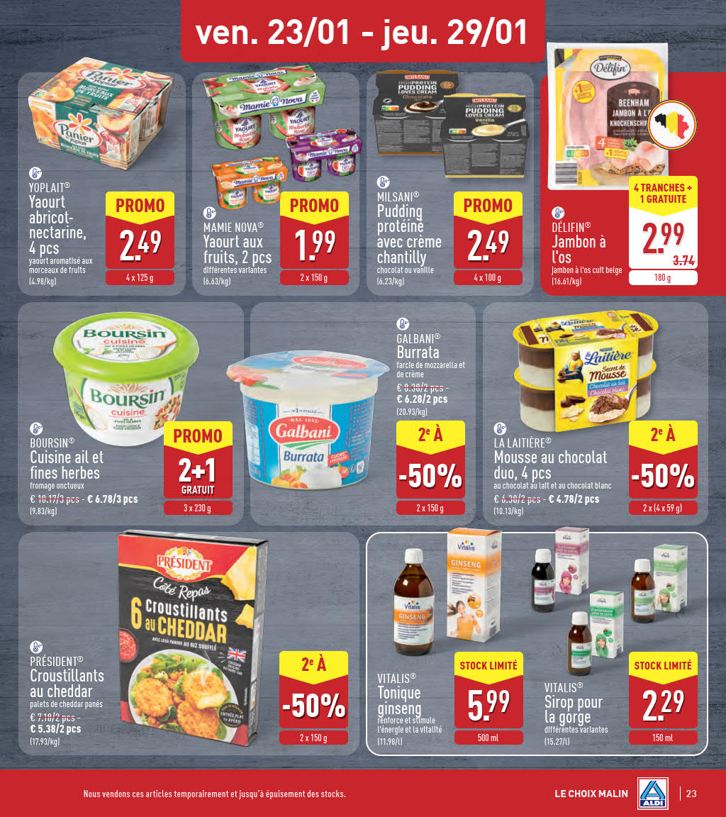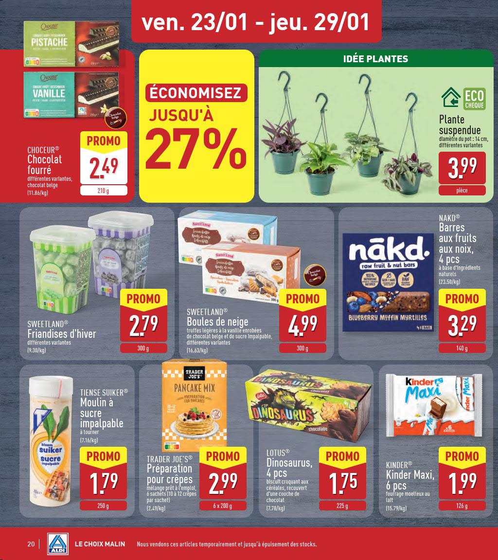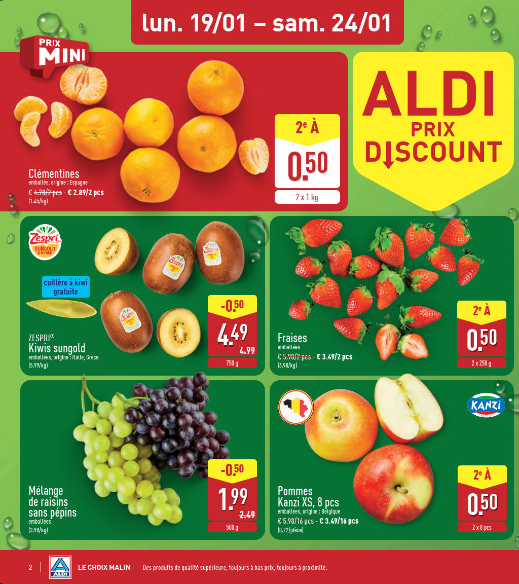 Vous êtes à la recherche de bonnes affaires et de réductions exceptionnelles? Ne cherchez plus loin que Aldi pour répondre à tous vos besoins en matière de shopping. Nos promotions et offres sont proposées à des prix incroyablement bas, et notre gamme de produits convient à tous les goûts et à tous les budgets. Consultez notre brochure de promotion valable du 19 janvier au 24 janvier, et explorez le catalogue pour créer votre liste de courses. Ne manquez pas nos offres hebdomadaires et nos offres exclusives et restez à jour avec les dernières offres et réductions chez Aldi.