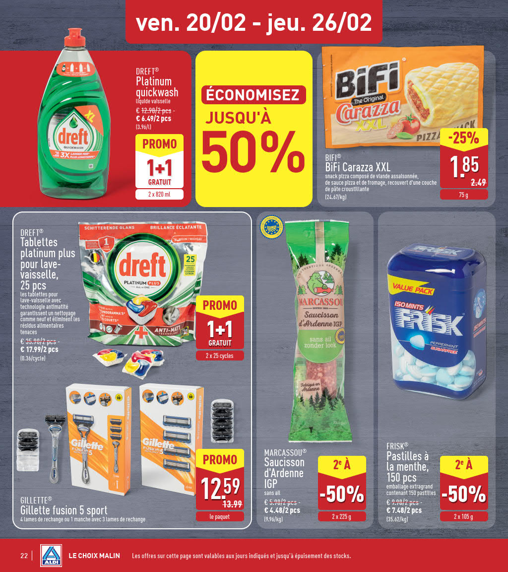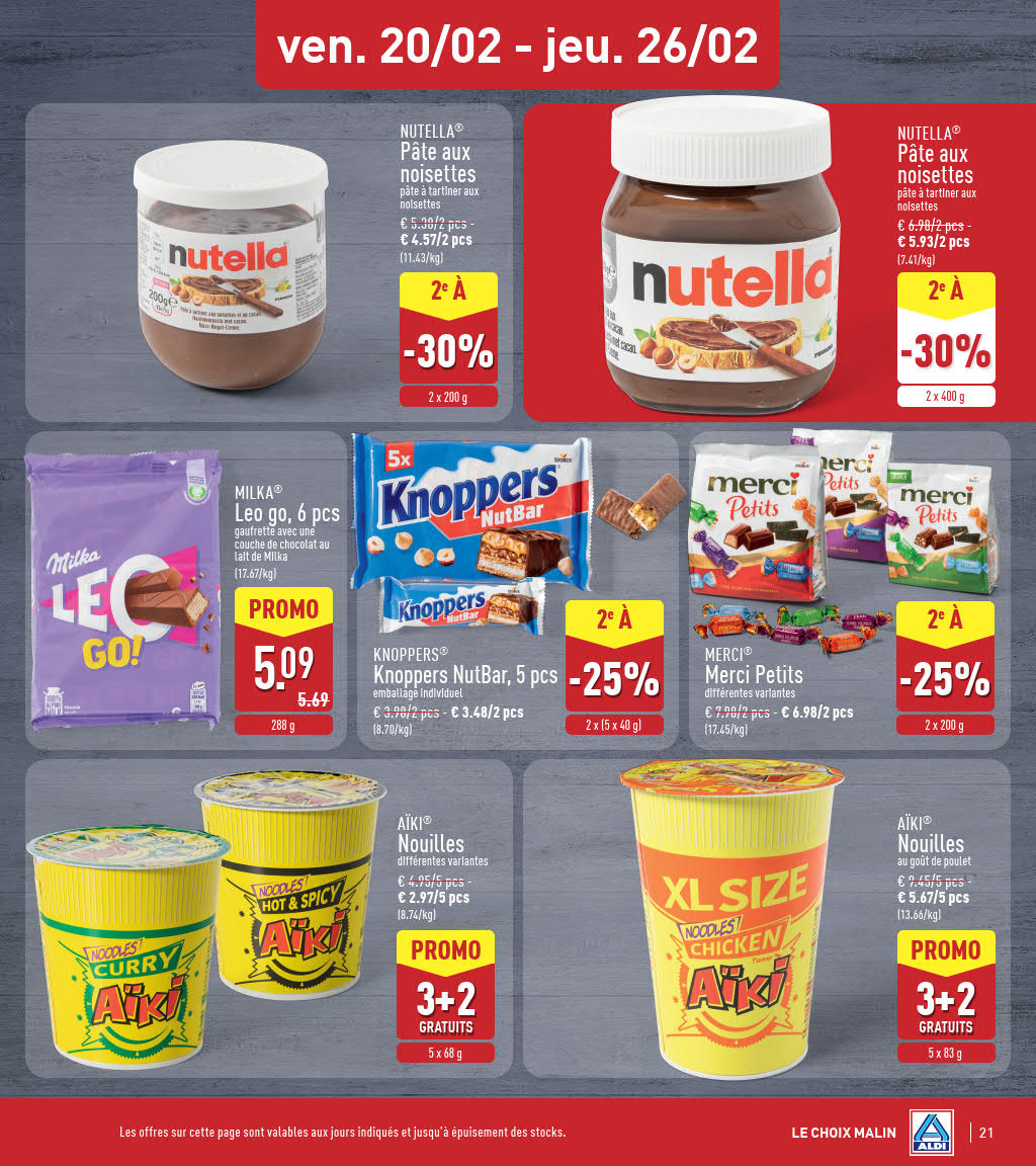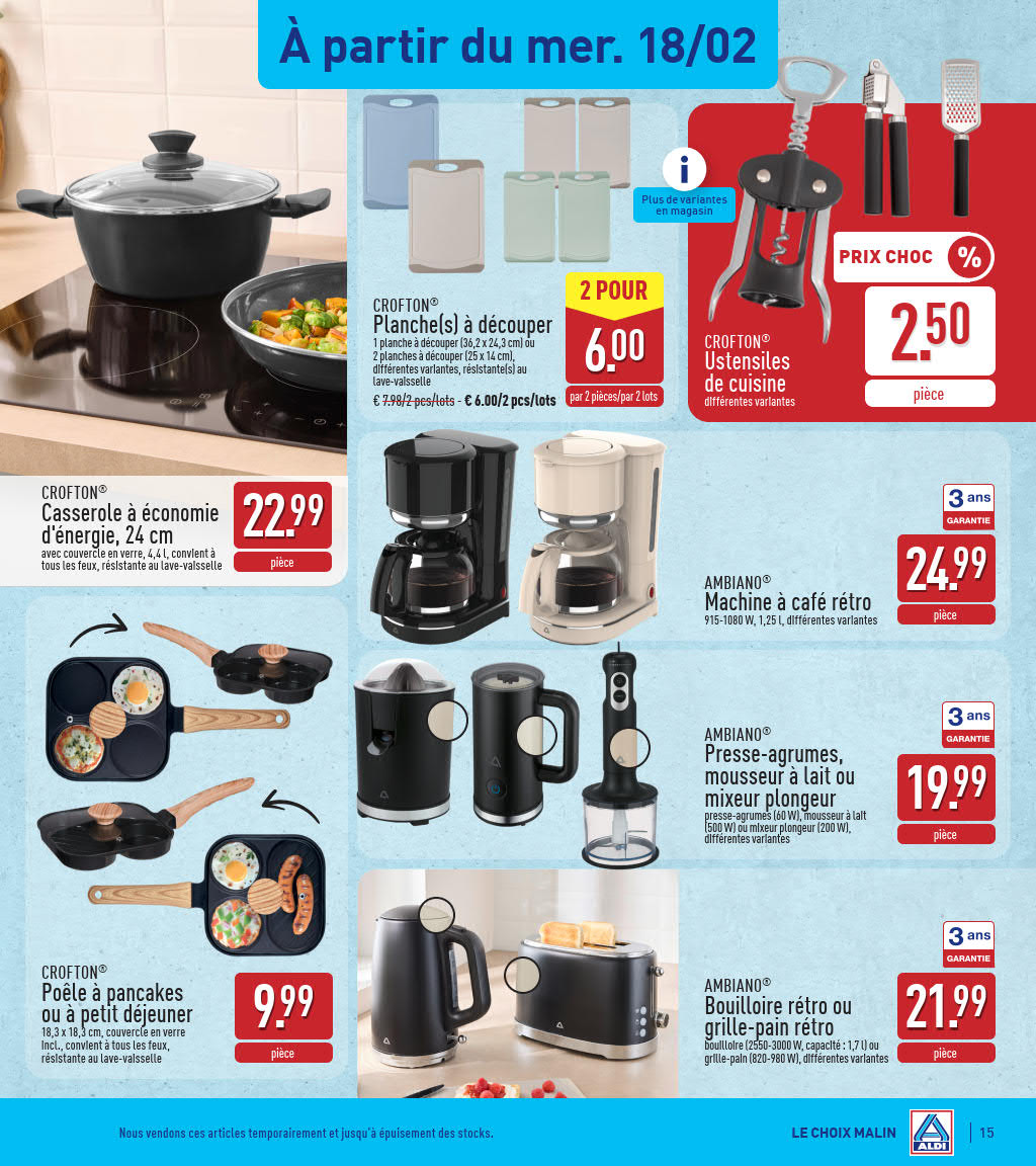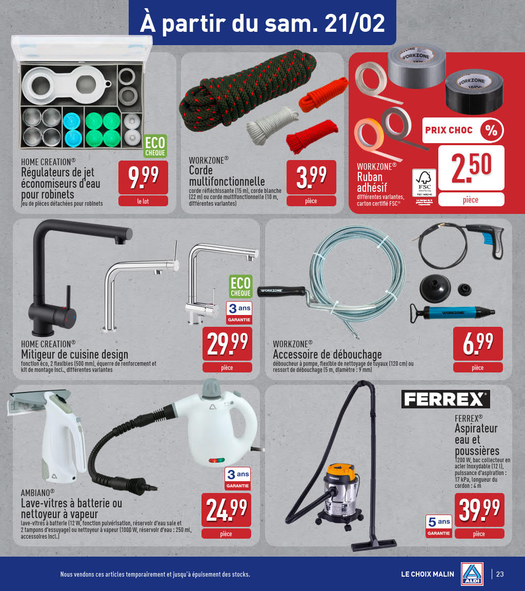 Nous proposons les derniers arrivages, vous offrant ainsi un large choix de produits parmi lesquels vous pouvez sélectionner vos favoris. Assurez-vous de parcourir nos produits et de sélectionner vos favoris avant l'expiration des offres. Faire du shopping de manière intelligente signifie réaliser des économies considérables, et les meilleures offres sont maintenant disponibles et valables jusqu'au 21 février. Alors ne tardez pas à faire vos courses. Notre personnel amical est toujours prêt à vous aider, vous pouvez donc être sûr d'un service client de qualité à chaque étape. Découvrez le shopping sans tracas et des économies importantes, uniquement avec Aldi.