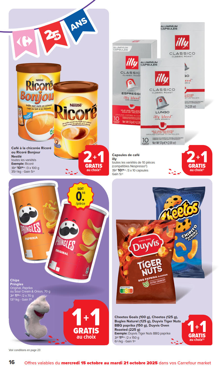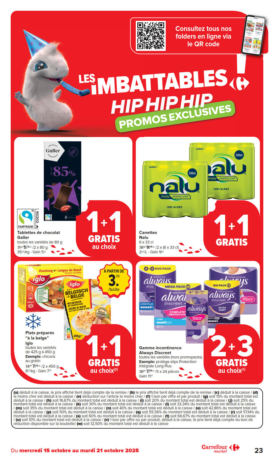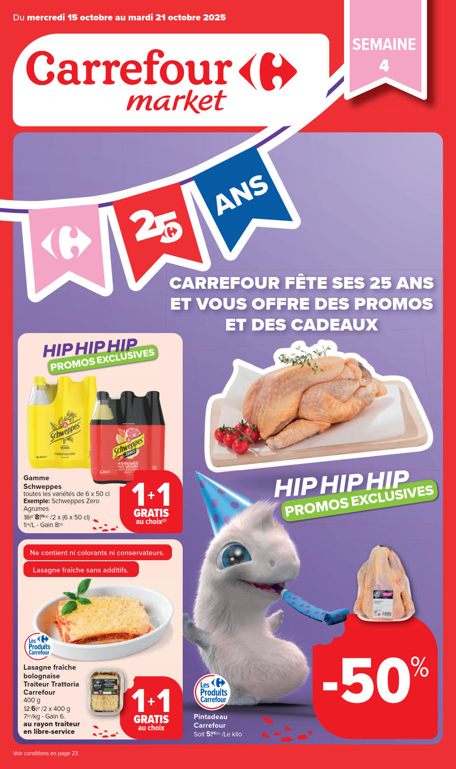 Vous êtes à la recherche de bonnes affaires et de réductions exceptionnelles? Ne cherchez plus loin que Carrefour Market pour répondre à tous vos besoins en matière de shopping. Nos promotions et offres sont proposées à des prix incroyablement bas, et notre gamme de produits convient à tous les goûts et à tous les budgets. Consultez notre brochure de promotion valable du 15 octobre au 21 octobre, et explorez le catalogue pour créer votre liste de courses. Ne manquez pas nos offres hebdomadaires et nos offres exclusives et restez à jour avec les dernières offres et réductions chez Carrefour Market.