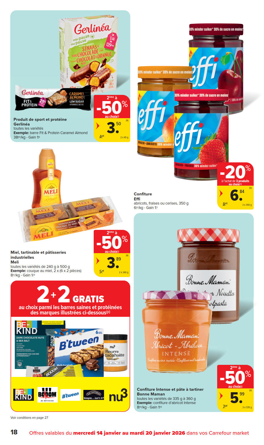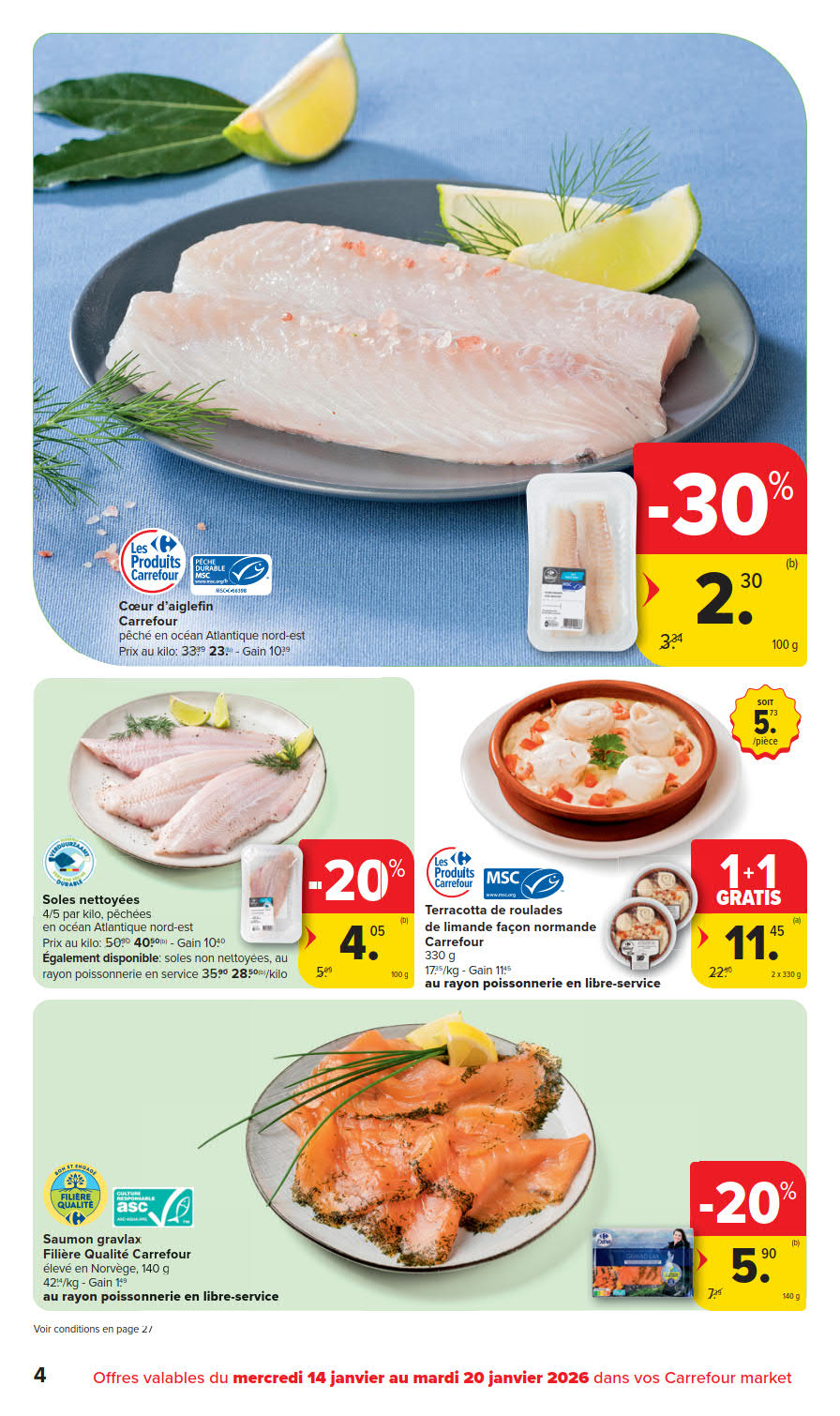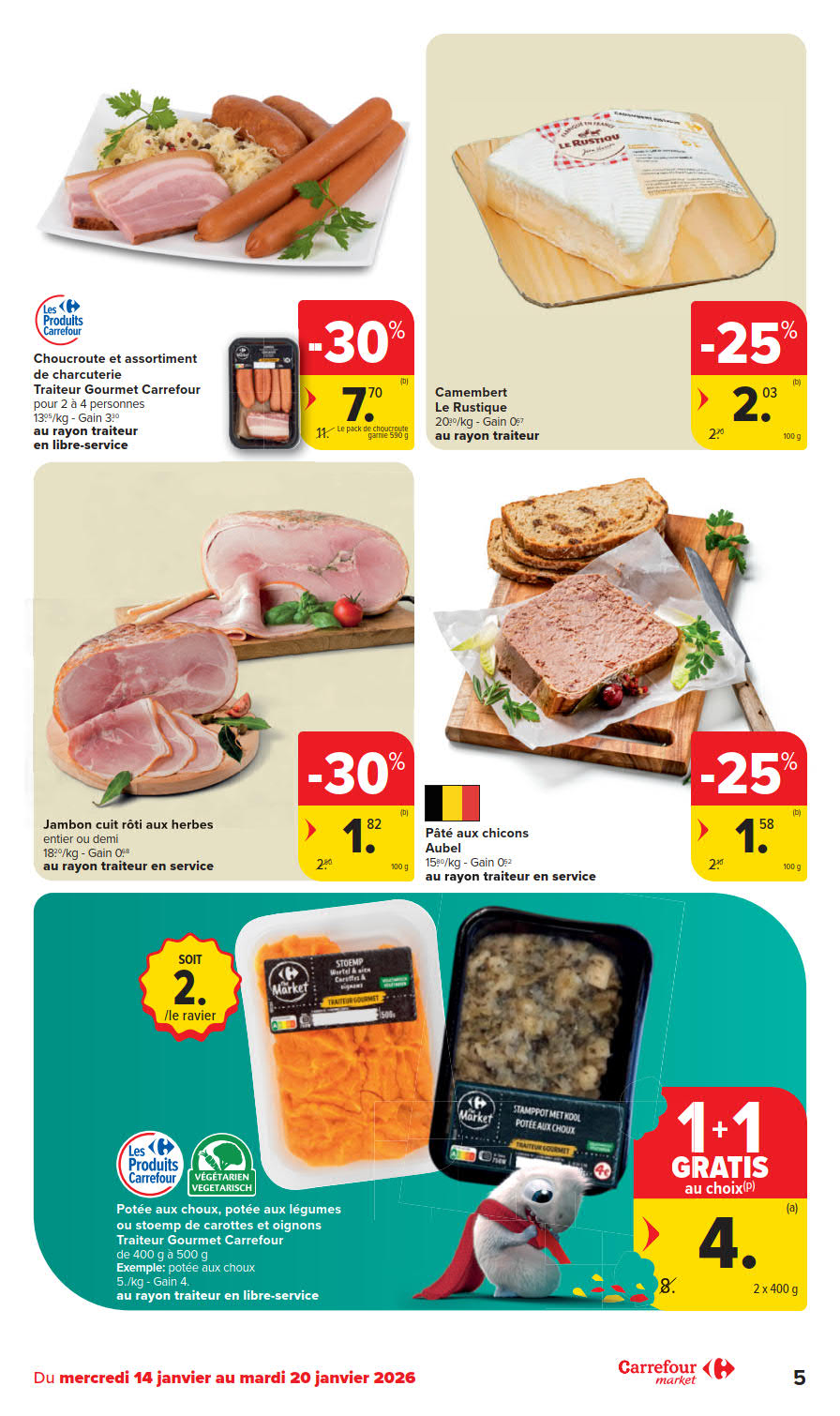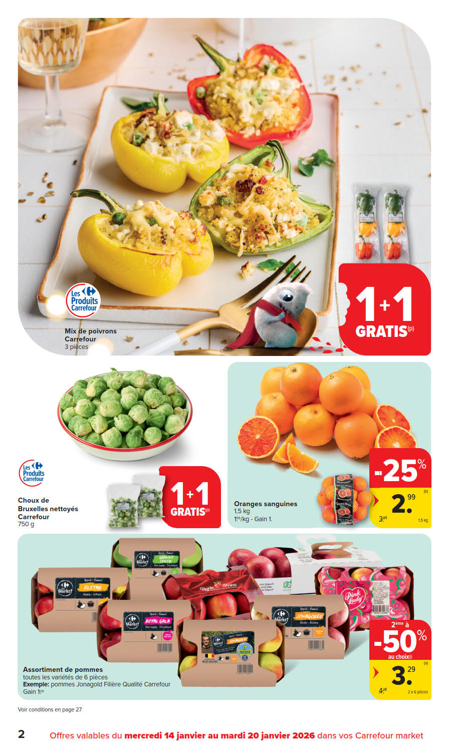 Vous êtes à la recherche de bonnes affaires et de réductions exceptionnelles? Ne cherchez plus loin que Carrefour Market pour répondre à tous vos besoins en matière de shopping. Nos promotions et offres sont proposées à des prix incroyablement bas, et notre gamme de produits convient à tous les goûts et à tous les budgets. Consultez notre brochure de promotion valable du 14 janvier au 20 janvier, et explorez le catalogue pour créer votre liste de courses. Ne manquez pas nos offres hebdomadaires et nos offres exclusives et restez à jour avec les dernières offres et réductions chez Carrefour Market.