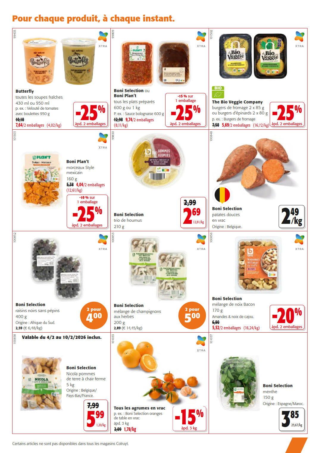 Nous proposons les derniers arrivages, vous offrant ainsi un large choix de produits parmi lesquels vous pouvez sélectionner vos favoris. Assurez-vous de parcourir nos produits et de sélectionner vos favoris avant l'expiration des offres. Faire du shopping de manière intelligente signifie réaliser des économies considérables, et les meilleures offres sont maintenant disponibles et valables jusqu'au 10 février. Alors ne tardez pas à faire vos courses. Notre personnel amical est toujours prêt à vous aider, vous pouvez donc être sûr d'un service client de qualité à chaque étape. Découvrez le shopping sans tracas et des économies importantes, uniquement avec Colruyt.