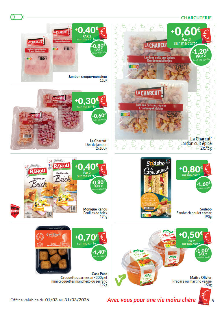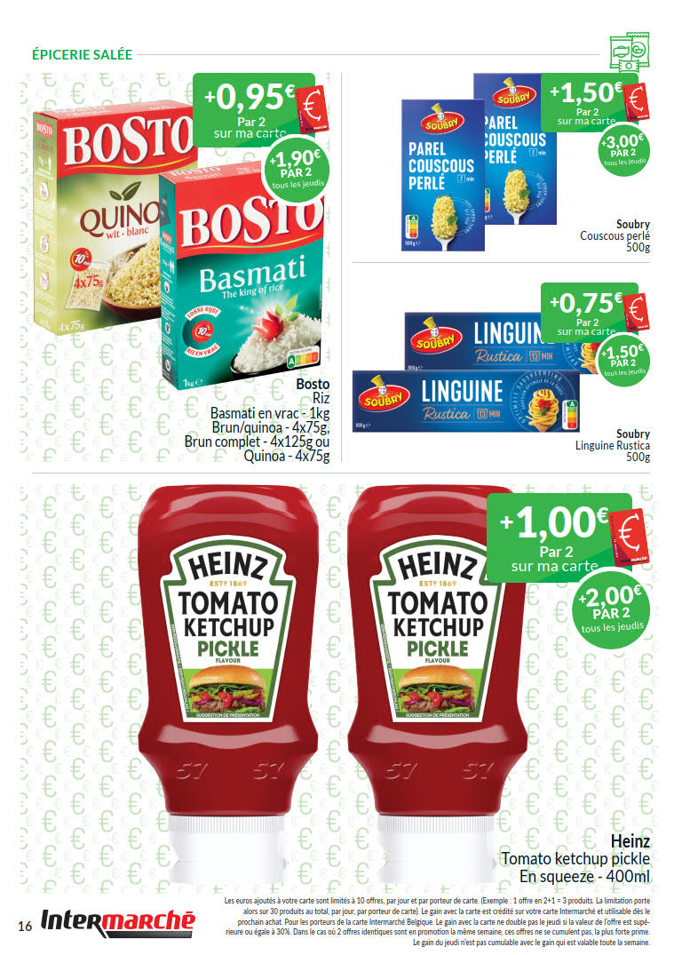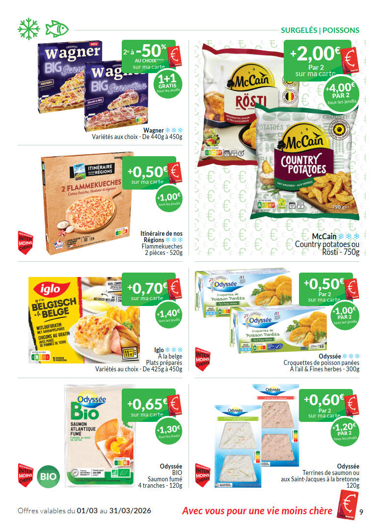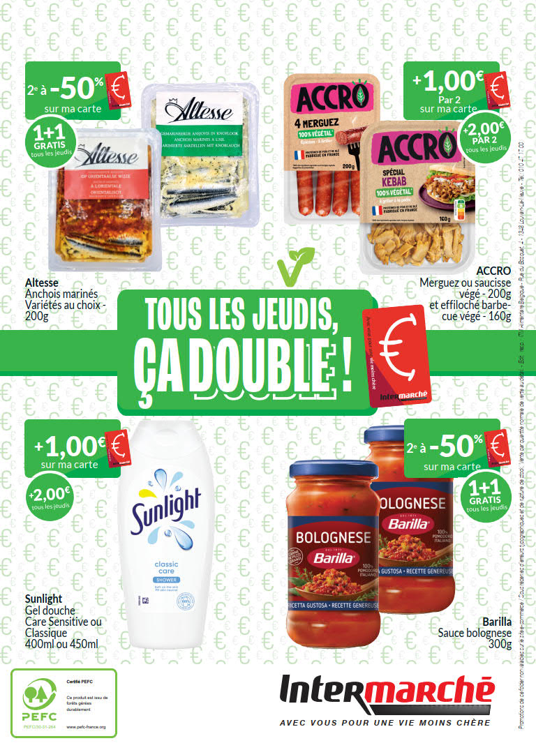 Vous êtes à la recherche de bonnes affaires et de réductions exceptionnelles? Ne cherchez plus loin que Intermarché pour répondre à tous vos besoins en matière de shopping. Nos promotions et offres sont proposées à des prix incroyablement bas, et notre gamme de produits convient à tous les goûts et à tous les budgets. Consultez notre brochure de promotion valable du 01 mars au 31 mars, et explorez le catalogue pour créer votre liste de courses. Ne manquez pas nos offres hebdomadaires et nos offres exclusives et restez à jour avec les dernières offres et réductions chez Intermarché.