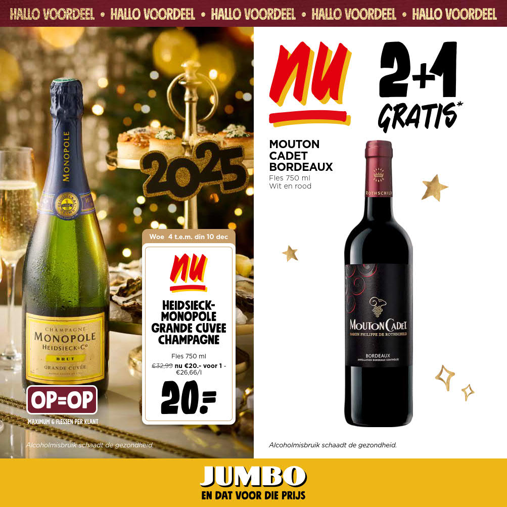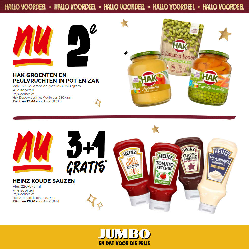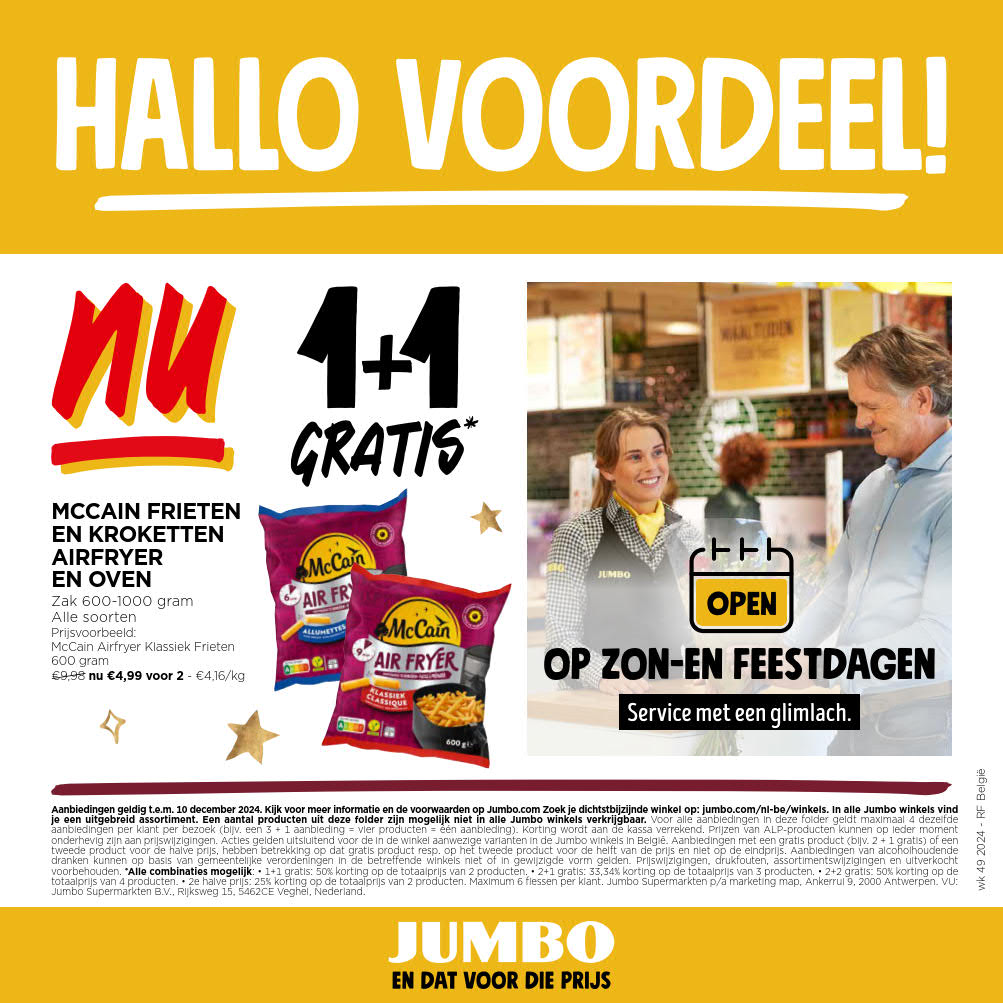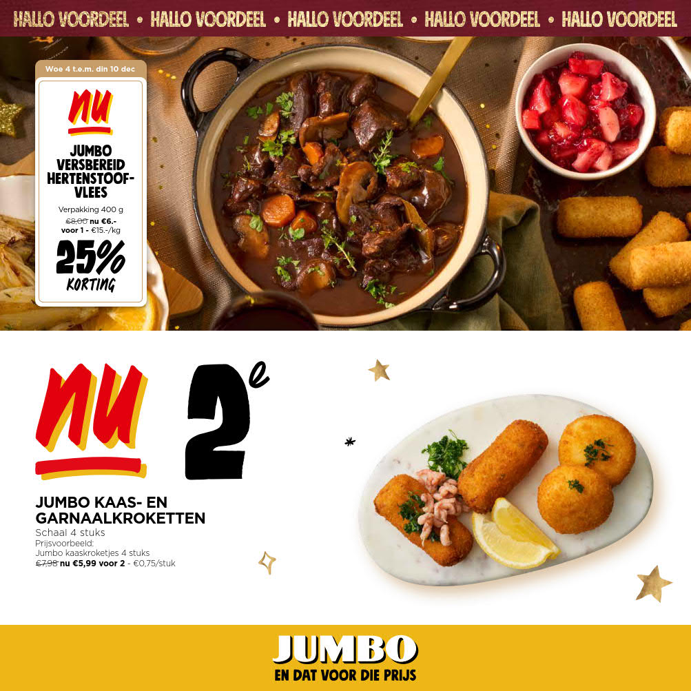 Vous êtes à la recherche de bonnes affaires et de réductions exceptionnelles? Ne cherchez plus loin que Jumbo pour répondre à tous vos besoins en matière de shopping. Nos promotions et offres sont proposées à des prix incroyablement bas, et notre gamme de produits convient à tous les goûts et à tous les budgets. Consultez notre brochure de promotion valable du 03 décembre au 10 décembre, et explorez le catalogue pour créer votre liste de courses. Ne manquez pas nos offres hebdomadaires et nos offres exclusives et restez à jour avec les dernières offres et réductions chez Jumbo.