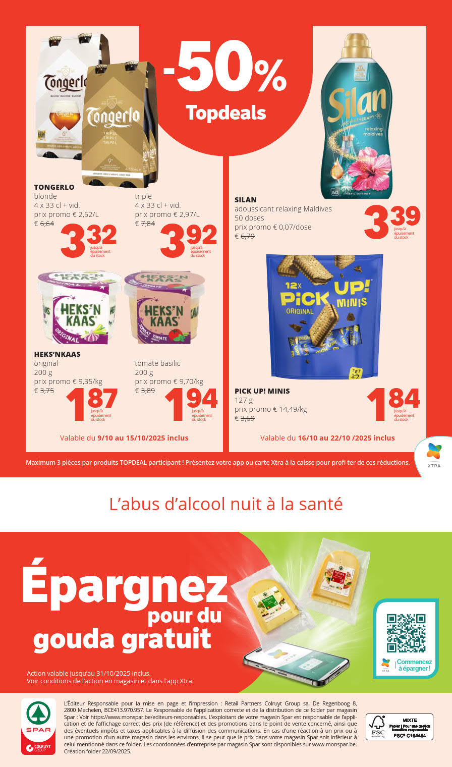 Vous êtes à la recherche de bonnes affaires et de réductions exceptionnelles? Ne cherchez plus loin que SPAR pour répondre à tous vos besoins en matière de shopping. Nos promotions et offres sont proposées à des prix incroyablement bas, et notre gamme de produits convient à tous les goûts et à tous les budgets. Consultez notre brochure de promotion valable du 09 octobre au 22 octobre, et explorez le catalogue pour créer votre liste de courses. Ne manquez pas nos offres hebdomadaires et nos offres exclusives et restez à jour avec les dernières offres et réductions chez SPAR.