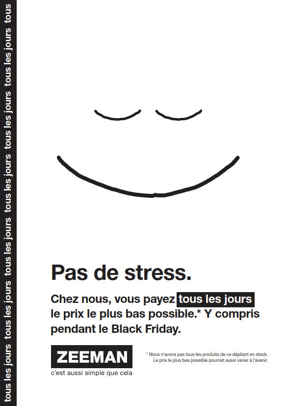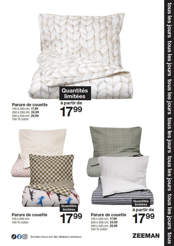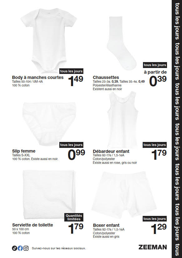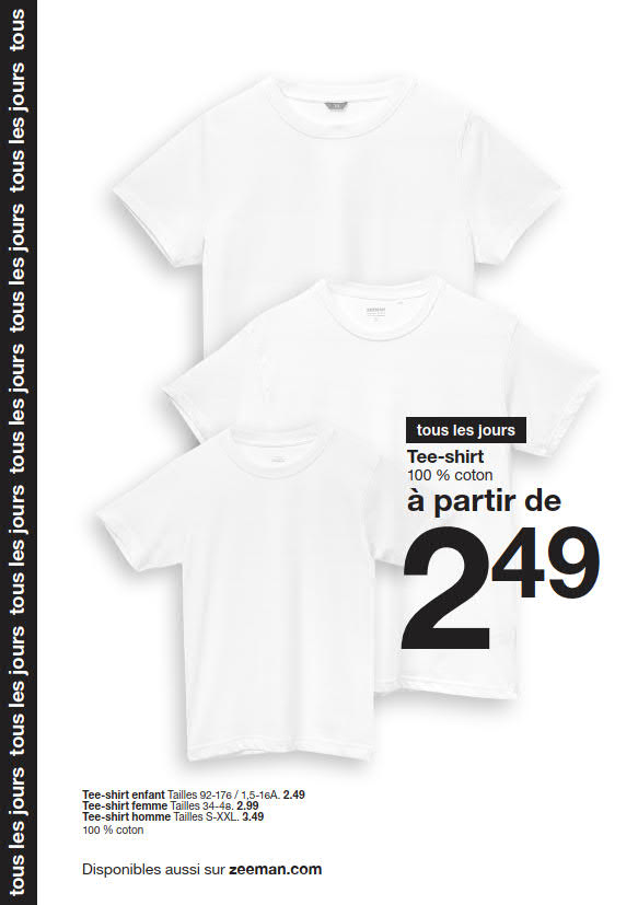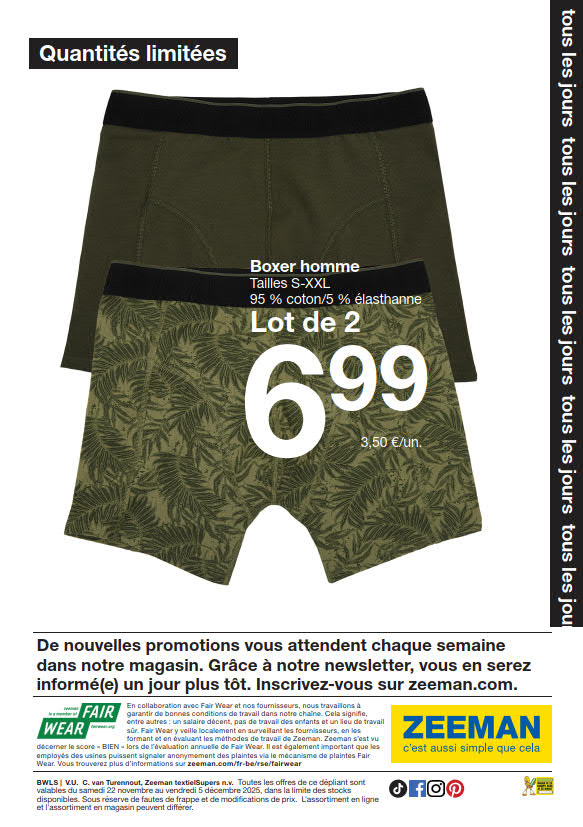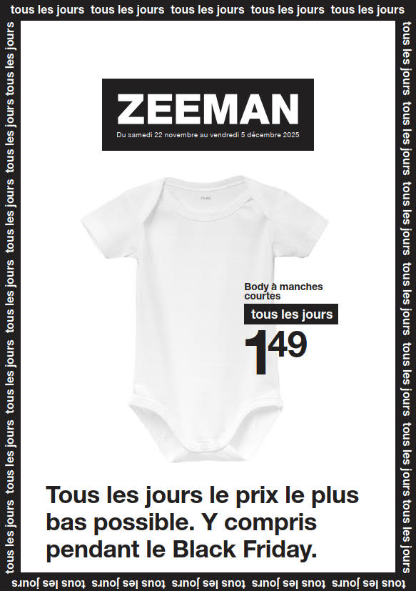 Vous êtes à la recherche de bonnes affaires et de réductions exceptionnelles? Ne cherchez plus loin que Zeeman pour répondre à tous vos besoins en matière de shopping. Nos promotions et offres sont proposées à des prix incroyablement bas, et notre gamme de produits convient à tous les goûts et à tous les budgets. Consultez notre brochure de promotion valable du 22 novembre au 05 décembre, et explorez le catalogue pour créer votre liste de courses. Ne manquez pas nos offres hebdomadaires et nos offres exclusives et restez à jour avec les dernières offres et réductions chez Zeeman.