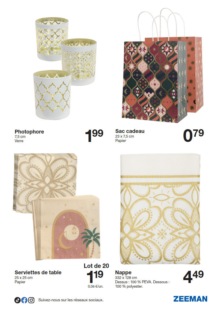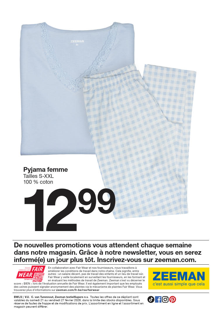 Vous êtes à la recherche de bonnes affaires et de réductions exceptionnelles? Ne cherchez plus loin que Zeeman pour répondre à tous vos besoins en matière de shopping. Nos promotions et offres sont proposées à des prix incroyablement bas, et notre gamme de produits convient à tous les goûts et à tous les budgets. Consultez notre brochure de promotion valable du 21 février au 27 février, et explorez le catalogue pour créer votre liste de courses. Ne manquez pas nos offres hebdomadaires et nos offres exclusives et restez à jour avec les dernières offres et réductions chez Zeeman.
