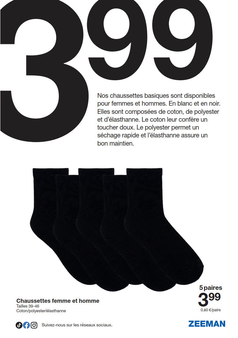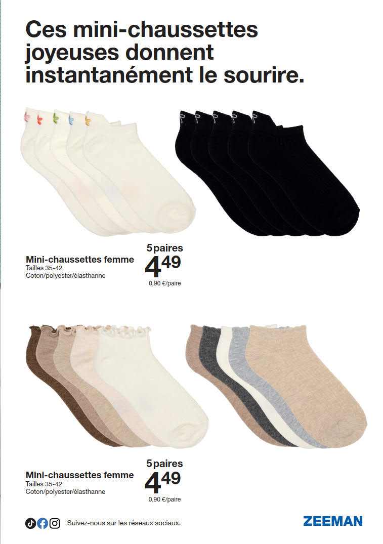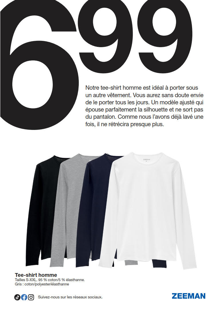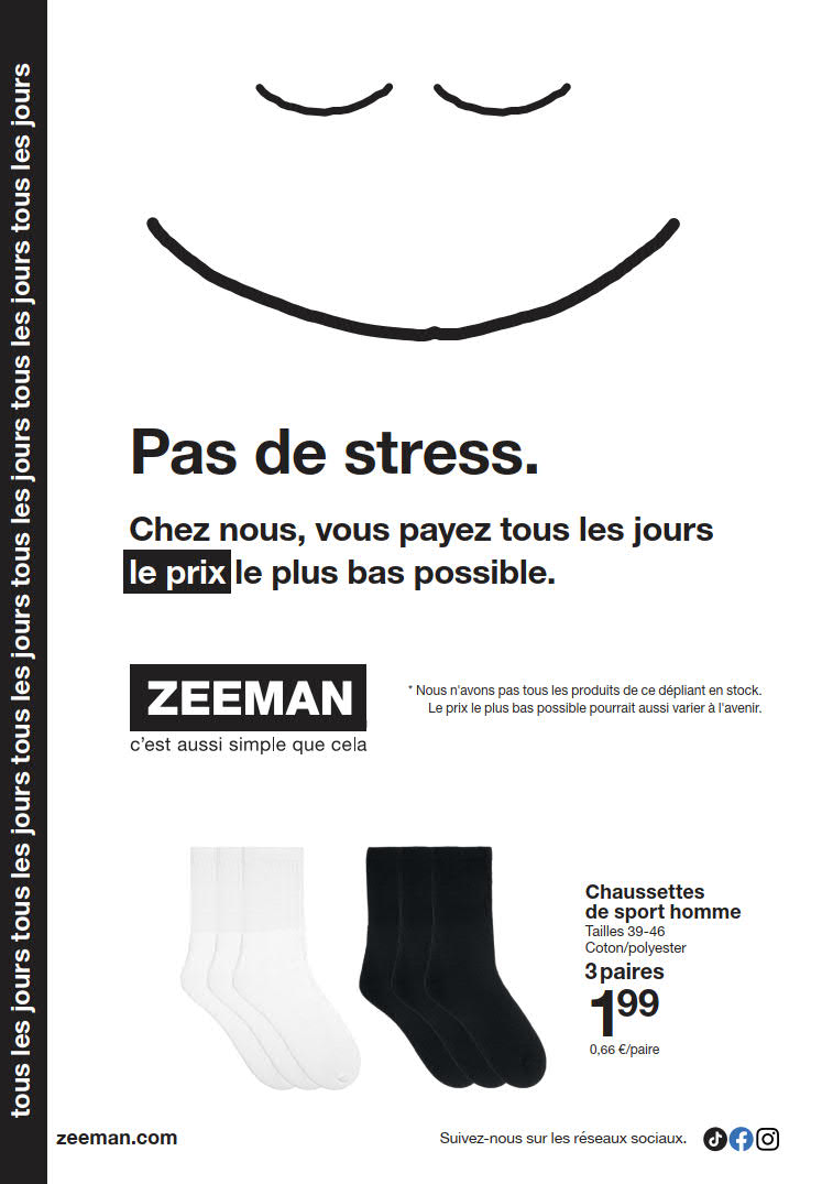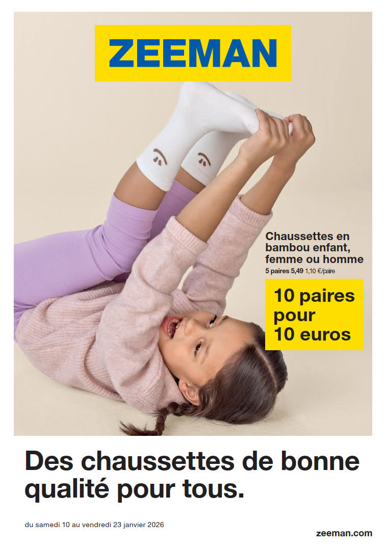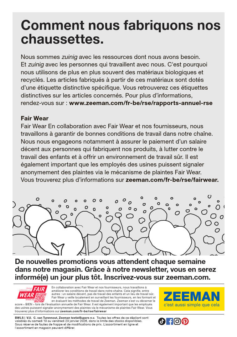 Vous êtes à la recherche de bonnes affaires et de réductions exceptionnelles? Ne cherchez plus loin que Zeeman pour répondre à tous vos besoins en matière de shopping. Nos promotions et offres sont proposées à des prix incroyablement bas, et notre gamme de produits convient à tous les goûts et à tous les budgets. Consultez notre brochure de promotion valable du 10 janvier au 23 janvier, et explorez le catalogue pour créer votre liste de courses. Ne manquez pas nos offres hebdomadaires et nos offres exclusives et restez à jour avec les dernières offres et réductions chez Zeeman.