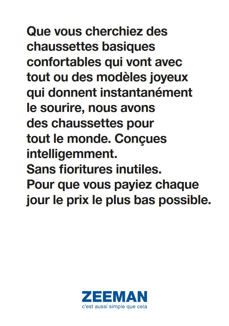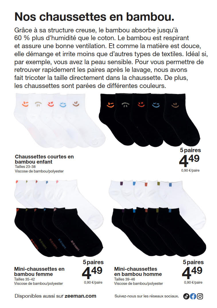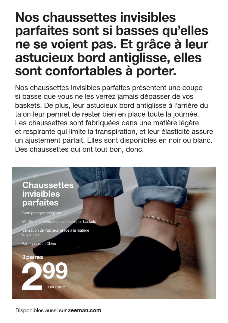 Nous proposons les derniers arrivages, vous offrant ainsi un large choix de produits parmi lesquels vous pouvez sélectionner vos favoris. Assurez-vous de parcourir nos produits et de sélectionner vos favoris avant l'expiration des offres. Faire du shopping de manière intelligente signifie réaliser des économies considérables, et les meilleures offres sont maintenant disponibles et valables jusqu'au 23 janvier. Alors ne tardez pas à faire vos courses. Notre personnel amical est toujours prêt à vous aider, vous pouvez donc être sûr d'un service client de qualité à chaque étape. Découvrez le shopping sans tracas et des économies importantes, uniquement avec Zeeman.